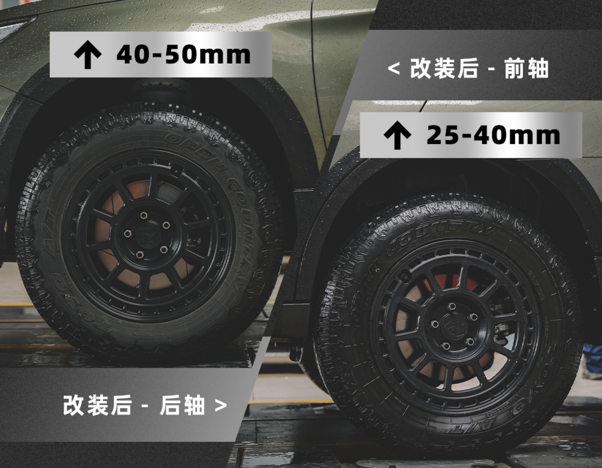 适配傲虎(BS)的B8 TerraSport套装内附详尽的安装指南和专用工具,拆卸与安装必须严格遵守规范,使用专业工具确保部件精确对齐,并根据说明书中的调节范围调整高度。根据官方数据,升级后的傲虎(BS)车身高度可根据需求调整,前轴可提升约1.5-2英寸(约40-50mm),后轴可提升1-1.5英寸(25-40mm),这不仅增强了车辆的通过性,还赋予了它更加威猛的外观,满足了车主对越野改装的极致追求。