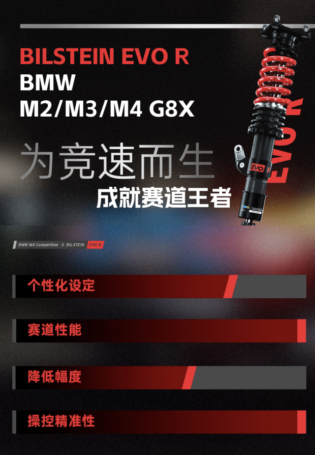 当赛道基因与公路法则碰撞,唯有BILSTEIN EVOR能定义这场性能革命的终极形态--移植于M4 G82的EVO R与征战纽博格林北环的BILSTEIN车队M4 GT4赛车搭载的EVO R功能一致,也是本次改装的关键。EVO R有着决不妥协的赛道基因,经由德国赛车事业部纯手工组装,提供专业赛事调校。铝制轻量化材质升级结构强度稳定可靠,提升驾驶稳定性的同时让过弯刷圈更快,带来强大循迹性与绝佳抓地力,无论是赛道极限攻弯,还是直线加速,都能带来惊人的性能提升。