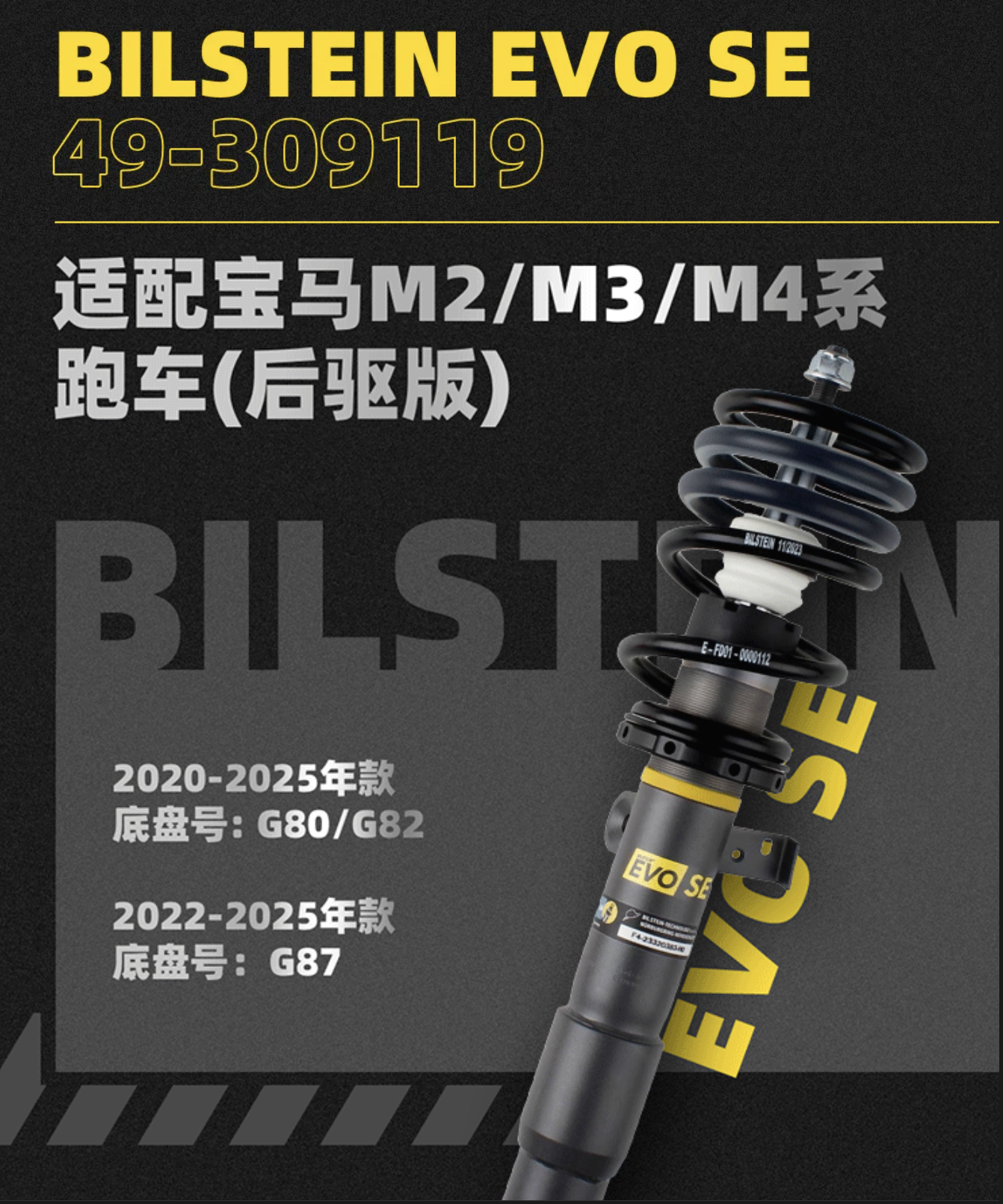 BILSTEIN EVO SE电调减震器套装,专为带电调减震系统的高性能车型打造,完美适配宝马M2,高低软硬全面可调,可兼顾日常舒适与赛道激进。